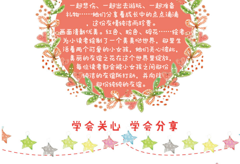 画面清新优美。红色、粉色、碎花……绘者为小读者绘制了一个美美哒世界,那里生活着两个可爱的小女孩,她们关心彼此,美丽的友谊之花在这个世界里绽放,每位读者都会被小女孩之间那份纯洁的友谊所打动,并向往那份纯纯的友谊。