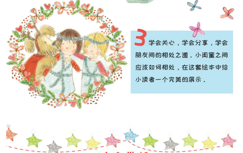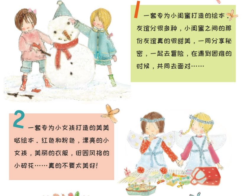 2. 绘本版小闺蜜长成记。两个漂亮的小女孩,她们一起欢笑、一起悲伤、一起出去游玩、一起准备礼物……她们分享着成长中的点点滴滴,这份友情纯洁而珍贵。