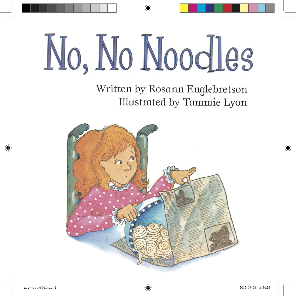 No,No Noodles(Stage ABC,Book 14)一书,讲一个小女孩不爱吃面条,妈妈一次次给小女孩盛了面条,小女孩一次次把它倒掉、喂狗等等。最后小女孩看着面条(Noodles?)也许是饿了,也许懒得再倒掉,终于尝了一口,然后她露出了笑容,开始狼吞虎咽地吃了起来(Noodles!)。
