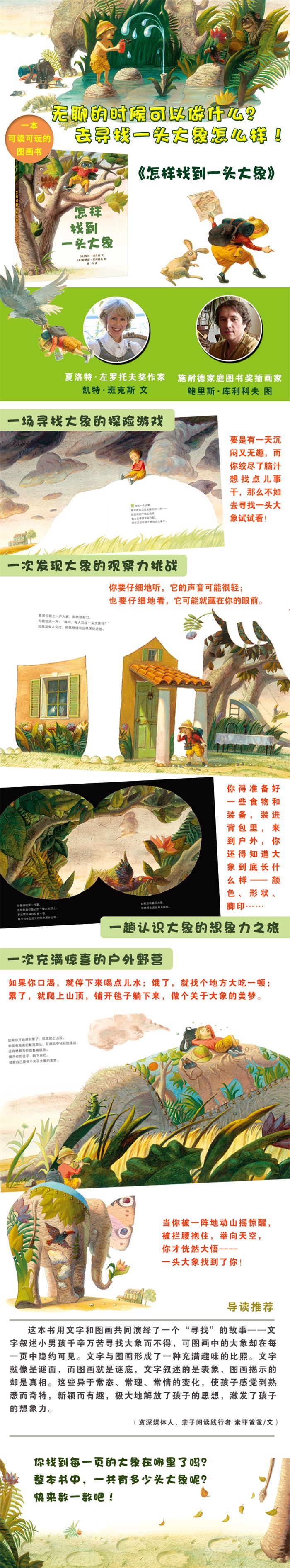 《怎样找到一头大象》是一本可读可玩的图画书,充满了想象力和童趣,故事中的小男孩一直在寻找大象,但其实大象早已悄悄地藏在了每一页的画面之中,等待着小读者来发现。 优美的语言、精致的图画、出乎意料的情节和画面,这是美国大奖作家凯特·班克斯和她的黄金搭档鲍里斯·库利科夫为孩子们带来的一本充满惊喜和挑战的新作品。