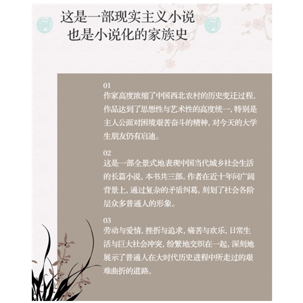 这是一部现实主义小说,也是小说化的家族史。作家高度浓缩了中国西北农村的历史变迁过程,作品达到了思想性与艺术性的高度统一,特别是主人公面对困境艰苦奋斗的精神,对今天的大学生朋友仍有启迪。这是一部全景式地表现中国当代城乡社会生活的长篇小说,本书共三部。作者在近十年问广阔背景上,通过复杂的矛盾纠葛,刻划了社会各阶层众多普通人的形象。劳动与爱情,挫折与追求,痛苦与欢乐,日常生活与巨大社会冲突,纷繁地交织在一起,深刻地展示了普通人在大时代历史进程中所走过的艰难曲折的道路。