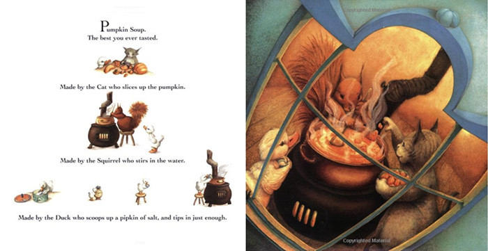 Deep in the woods in an old white cabin, three friends make their pumpkin soup the same way every day. The Cat slices up the pumpkin, the Squirrel stirs in the water, and the Duck tips in just enough salt. But one day the Duck wants to stir instead, and then there is a horrible squabble, and he leaves the cabin in a huff. It isn't long before the Cat and the Squirrel start to worry about him and begin a search for their friend. Rendered in pictures richly evoking autumn, Helen Cooper's delightful story will resonate for an child who has known the difficulties that come with friendship. Included at the end is a recipe for delicious pumpkin soup.