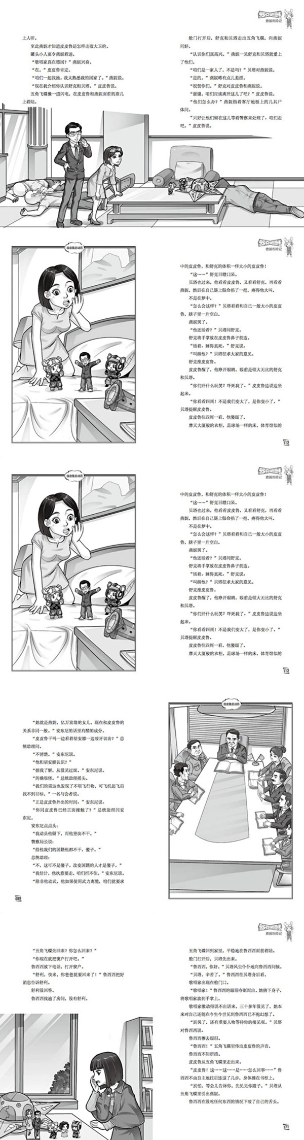 “据我们了解,皮皮鲁是极有潜力的物理学家, 其智慧*不亚于爱因斯坦。他的才智如果正常发挥, **能发明出改变世界的东西。我们应该尽*大努力 留住他,让他的才能为我国服务。退一步说,即使留 不住,也不能放他走。哪个**得到他,哪个**就 会**一步。”情报机构的首脑说。 “若干年前,他曾预报过一次大地震。他一定是 掌握了某种极为**的预报地震的方法。”一位特邀 参加会议的科学家说。 “**傍晚,在一幢别墅里发生了一起很奇怪的 人命案。五名男士用自己的*打死了自己。经过现场 勘查,证实他们不是 而是他杀。可是凶手是如何 让死者自己朝自己开*的呢?经过计算**的飞行距 离,大约是在两米左右,谁能自己拿着*在距离自己 两米远的地方开*向自己射击?”警官说。 “那是怎么回事?”总统助理问。 “只有一种解释,**射出后,又拐了一百八十 度的弯儿,射到了自己的身体里。”警官说。 “这不可能。”有人反驳。 “我们在现场发现了两个人的脚印,一男一女, 其中男人的脚印与皮皮鲁的身材相符。”警官打开文 件夹,拿出脚印照片。 “皮皮鲁?他和那些人有什么关系?为什么要杀 他们?”总统助理皱眉头。 “那几个人的身份已经查明了,其中一个叫大卫 ,是一家集团公司的总裁。另外的几个人是雇员。” 警官说。 “皮皮鲁和大卫从前认识?”有人间。 “不清楚。”警官说。 “就是说,皮皮鲁可能是使用带来的那架小型飞 行器击毙大卫的?”总统助理发挥自己的想象力。 “可能是大卫先开的*,那架小型飞行器掉转了 **的运行方向。”警官说出了令人毛骨悚然的推断 。 “立即以谋杀罪逮捕皮皮鲁,不要伤害他,让他 为我们服务。”总统助理说,“同时封锁一切出境口 ,不让皮皮鲁离境。” “我们决定成立特别行动小组,任命*出色的侦 探为组长。”警官说。 “有人选了吗?”总统助理问。 “安东尼。”警官说。 在座的人都点头。安东尼是该国***的侦探, 破案率100%。 “有进展随时向我报告。”总统助理站起来。 会议结束。 安东尼四十一岁,日尔曼人,高大魁梧,能双手 同时持*射击,弹无虚发,会驾驶各种车辆,有飞行 执照,大脑敏捷,脑沟回错综复杂,有神探之称。 此刻,安东尼正驾驶汽车行驶在闹市区。他刚结 了一桩诈骗案,准备去情人的公寓。 汽车停在一幢公寓楼旁。安东尼乘电梯上楼。他 按那个按过无数次的门铃。 一个迷人的姑娘开门。她看见是安东尼,眼睛里 透出欣喜的光芒。 安东尼刚要吻她,兜里的手机响了。 “讨厌。”安东尼一边吻姑娘一边掏电话。 r。喂,什么?局长找我?晚会儿不行吗?就晚 十分钟,不行?这个断子*孙的老狐狸。”安东尼把 手机塞进兜里。 “马上就走?”姑娘显然不愿意。 “待会儿再来,我这人你知道,该**办的事决 不拖到明天。”安东尼冲姑娘做个鬼脸,走了。 姑娘特痛苦。安东尼还不如不来,本来她看电视 看得好好的。 安东尼开车响着警笛赶回警察局。 局长将拘捕皮皮鲁的任务交给他。 “总统已经关注此事。你务必在三天之内找到皮 皮鲁。”局长说。 安东尼点点头。 “需要几个人?”局长问。 “我自己都嫌多。”安东尼站起来准备告辞。 “轻视不得。他可能有特殊**。”局长提醒安 东尼不要麻痹。 安东尼冲局长一笑,转身走了。 他赶到皮皮鲁下榻的皇都饭店,埋伏在那里的便 衣一见头号侦探来了,就知道自己监视的目标上档次 了。 安东尼把皮皮鲁的箱子检查了一遍。他把皮皮鲁 的护照装进自己兜里。皮皮鲁的照片已经印在他脑海 里了。 箱子里的一套微型餐具引起了安东尼的注意。 这是一套类似于小女孩儿过家家的餐具。安东尼 掏出手机。 “皮皮鲁同行一共几个人?”安东尼问。 “就他自己。”警察局值班员回答。 “没有小孩儿?” “**没有。” P15-18