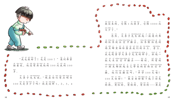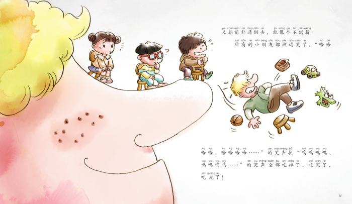 大鼻子先生是一个鼻子大大的、头发卷卷的外国老师。他很“笨”,第一次上课就屁股坐歪了,扑通一声坐到了地上;他很“懒”,让小朋友自己叮叮叮地往墙上敲钉子,把画挂上去;他很“怪”,带小朋友过睡衣节袜子节……可是,和大鼻子先生在一起,小朋友们变得更加快乐和聪明伶俐了,这是为什么呢?