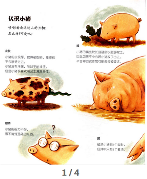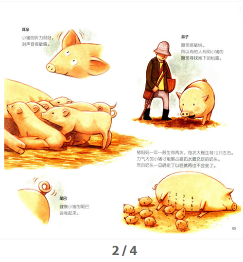 《小猪,小猪》以绘本的形式,图文并茂地讲述了猪肉的相关知识,包括猪的养殖和相关的猪肉产品等,还有世界各地对猪肉不同看法。这是本以孩子的视角,生动有趣地介绍了餐桌上食品的相关知识,是一本非常适合亲子阅读和儿童自主阅读的科普类图书。