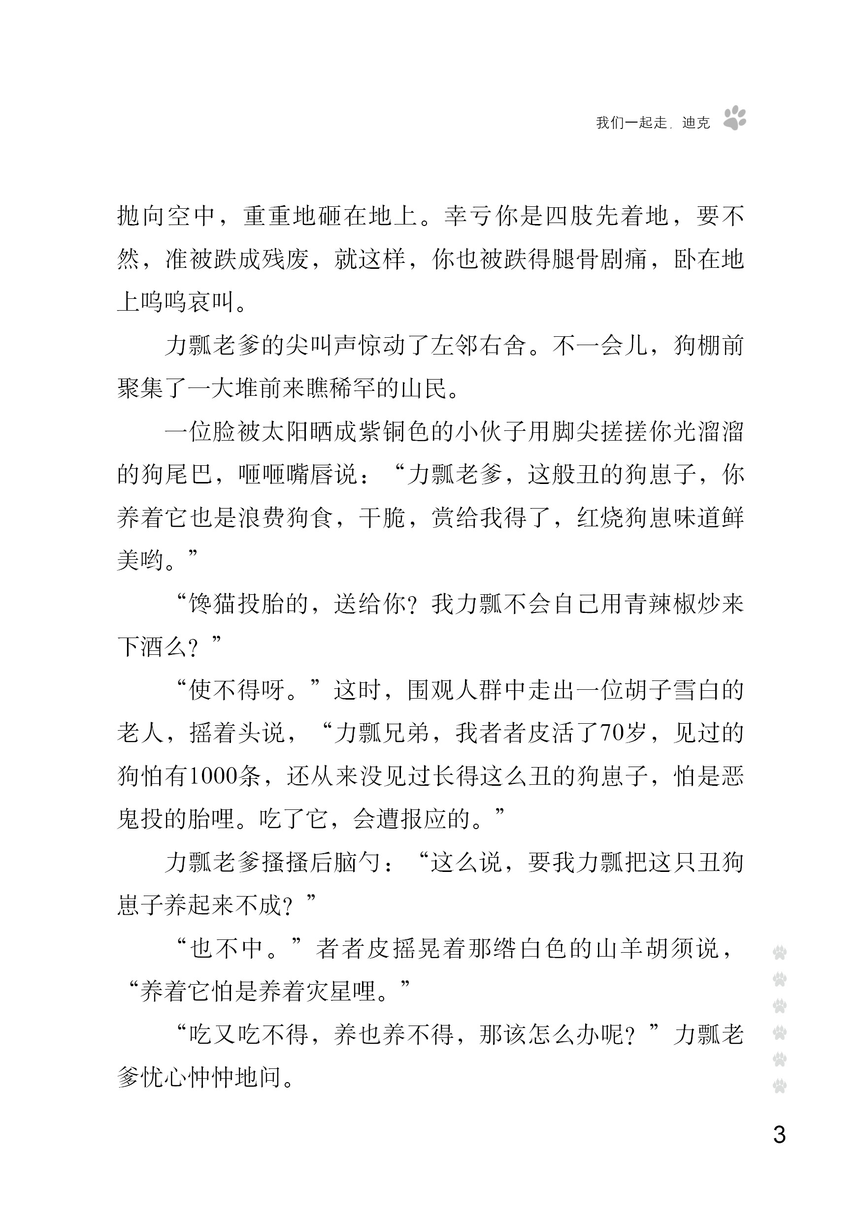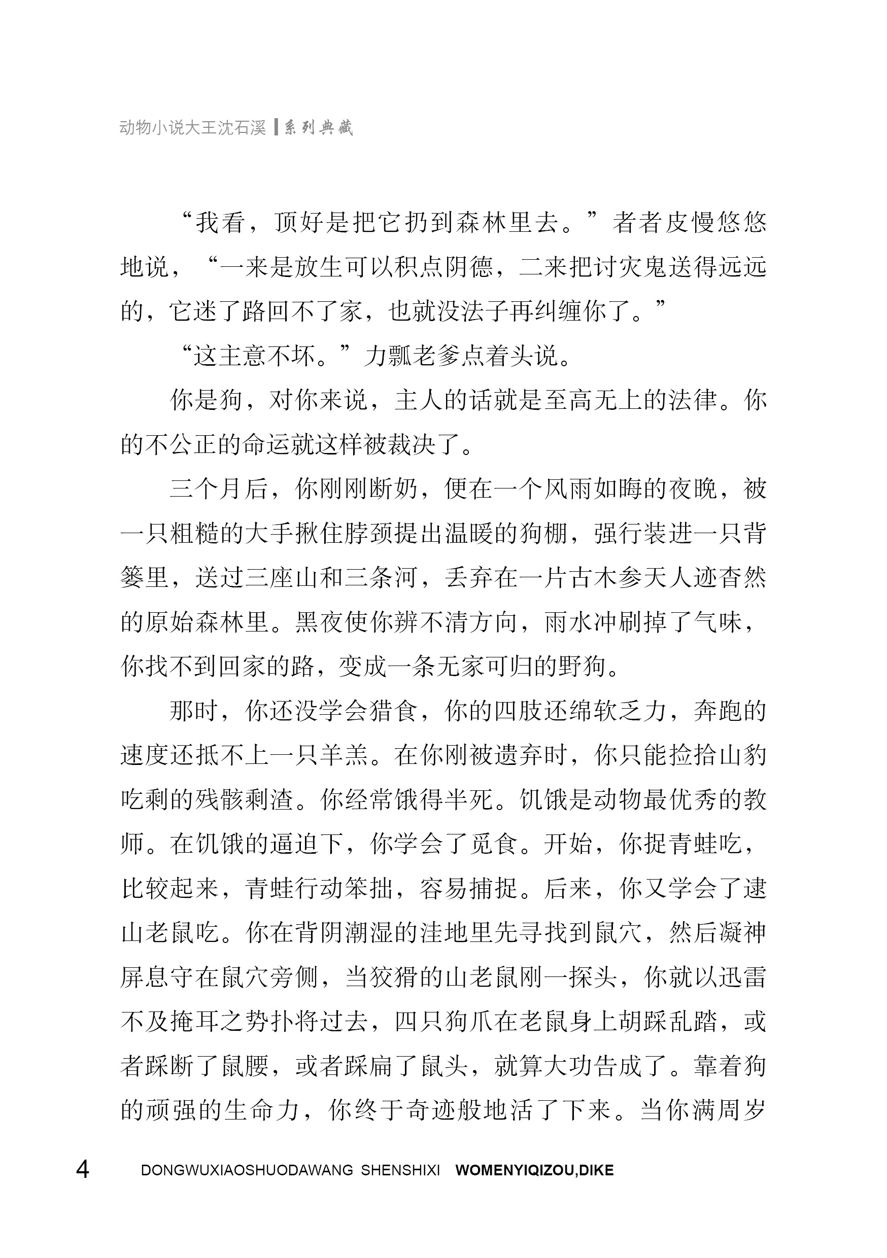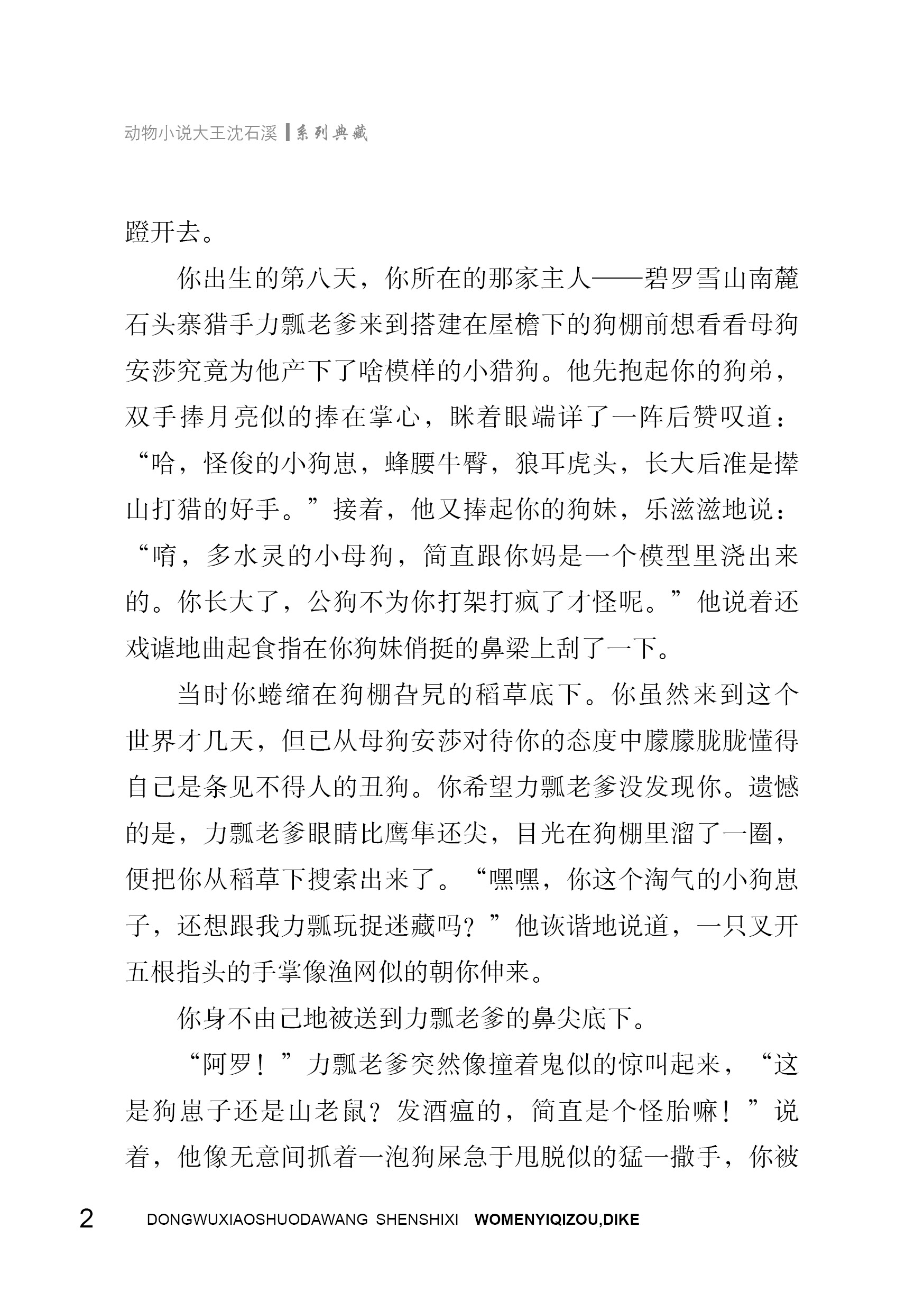 你的母亲安莎和父亲大黄蜂都是血统纯正、出身高贵、相貌美丽、性情勇猛的猎犬,和你同窝出生的一只狗弟和一只狗妹都继承了父母身上的优点长得漂亮可爱,但不知为什么,你却一生下来就丑得出奇。一副斜巴眼,眼角挤满了狗眵糊,鼻梁平塌,天生一张歪嘴,上嘴吻还有一个V形豁口,露出排列极不整齐的牙齿,无法闭严的嘴角时时淌着一股又黏又滑的口涎;你长着一身乱糟糟的没有光泽的狗毛,就像锅底黑,仿佛从娘胎里就患有疥疮,好几处体毛脱落,露出难看的青白色的狗皮;又细又短的尾巴光溜溜的不长一根狗毛,比老鼠尾巴好看不了多少。俗话说,母不嫌儿丑。但你实在太丑了,连母狗安莎都觉得扎眼,给你喂奶时闭着眼睛不看你,也不用舌头舔你,夜里山风料峭你想跟着狗弟、狗妹们钻进它的怀里取暖睡觉,也被它厌恶地用爪子踢蹬开去。