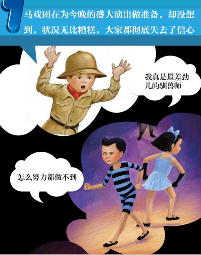 一场盛大的马戏团表演马上就要开始了,导演却发现所有人都出了问题:钻铁圈的狮子总是不成功,让驯兽师拉里灰心丧气;空中飞人组合一直无法完成后的关键动作,两个人都很生气;小丑骑着独轮自行车扔保龄球,却总是从自行车上摔下来,非常自责。大家遇到问题,自暴自弃,却没有想办法解决问题,导演决定帮助大家找回自信。在导演里克的帮助下,大家讨论了一些很有用的想法。马戏团的演员们又开始了新的练习,他们尽管还面临很多的失败和错误,但是大家都找到了自信,于是一场精彩的演出即将开始。