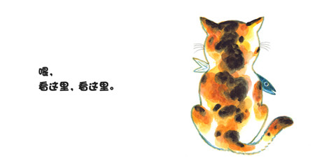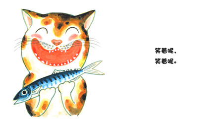 小猫背对着大家,干什么呢?“喂,看这里。”小猫捧着鱼,转过身来说:“笑着呢,笑着呢。”
