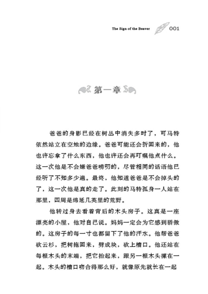爸爸的身影已经在树丛中消失多时了,可马特依然站立在空地的边缘。爸爸可能还会折回来的,他也许忘拿了什么东西,他也许还会再叮嘱他点什么。这一次他是不会嫌爸爸唠叨的,尽管相同的话语他已经听了不知多少遍。最终,他知道爸爸是不会掉头的了,这一次他是真的走了。此刻的马特孤身一人站在那里,四周是绵延几英里的荒野。