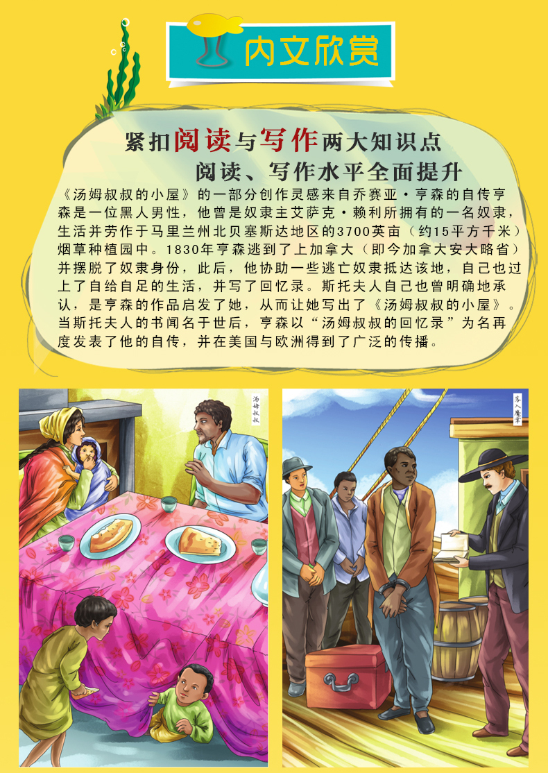 《汤姆叔叔的小屋》既描写了不同性格的黑奴,也描写了不同类型的奴隶主嘴脸。它着力刻画了接受奴隶主灌输的基督教精神、逆来顺受的主人公汤姆;也塑造了不甘心让奴隶主决定自己生死的、具有反抗精神的黑奴典型一一伊丽莎和她的丈夫乔治·哈里斯。同时,也揭示了各种类型的奴隶主的内心世界和表现。这本书通过对汤姆和乔治·哈里斯夫妇这两条线索交叉叙述的方式,告诉读者:在奴隶制度下,逆来顺受、听从奴隶主摆布的汤姆难逃死亡的命运,而敢于反抗、敢于斗争的乔治夫妇得到了新生。因此,《汤姆叔叔的小屋》对美国社会发展起到了积极作用,特别是对美国废奴运动和美国内战中以林青为代表的正义一方获得胜利,产生了巨大的作用。作为一本文学作品,美国著名诗人亨利·朗费罗说它是"文学史上zui伟大的胜利"。