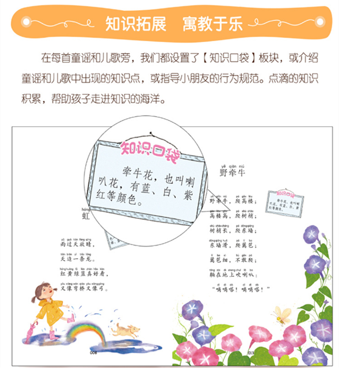 “读读童谣和儿歌”这套丛书中所选的童谣和儿歌,或是口口相传的经典童谣,或是富有人生至理的小儿歌,内容经典而丰富,读来朗朗上口,极富韵味。书中搭配童趣十足的插图,更有“知识口袋”扩展孩子的知识。诵读童谣和儿歌,滋润孩子的心灵,让孩子遨游在美丽的童真世界