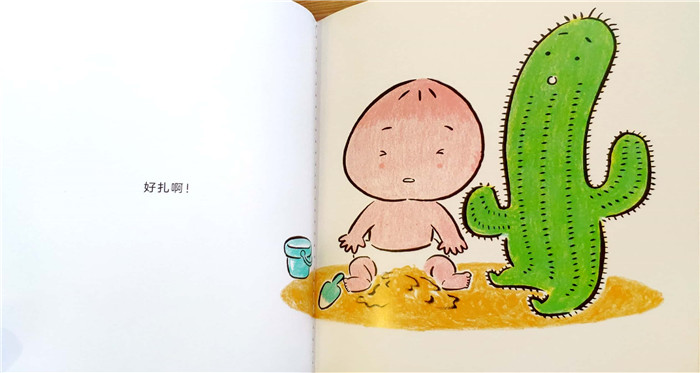 “亲亲小桃子”系列非常适合0-3岁低幼阅读,首先,它运用了大量的拟声词和动词,适合这个阶段宝宝的语言特点;形象和色彩简明突出,符合宝宝的审美习惯。其次,它很好地平衡了日常生活的常见事物和绘本世界的独特事物——吃饭,泡澡,玩泥巴,孩子从中看到自己的生活,不过呢,是和小狮子一起吃饭,和仙人掌一起泡温泉,把大泥巴车开到海边,又让孩子有了兴奋的期待。
