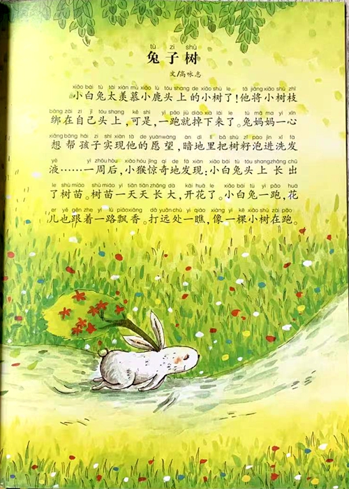 小白兔太羡慕小鹿头上的小树了!他将小树枝绑在自己头上,可是,一跑就掉下来了。