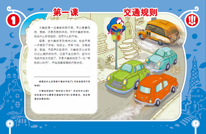 大嘴叔是一位勇敢的旅行家!但是,大嘴叔遇到了大麻烦!面对城市的车水马龙,大嘴叔简直不知如何是好。小朋友们,让我们一起来帮助大嘴叔吧!我们跟他一起去开心球交通学校!通过十节课的学习,大嘴叔就会完全弄明白像迷宫一样的道路,搞清楚看起来杂乱无章的交通规则!让我们一起来为大嘴叔加油!