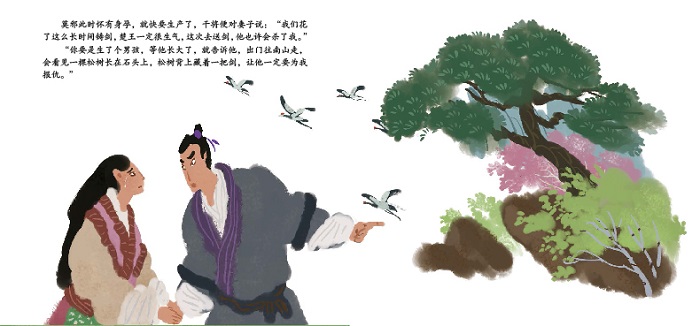 楚国有一对夫妻,男的叫干将,女的叫莫邪,均是铸剑好手。楚王慕名请他们帮自己铸一把宝剑,这对夫妻耗时三年,为楚王打造了一雄一雌两把宝剑。干将料到自己为楚王献剑,凶多吉少,只带了一把雌剑去,果不其然,楚王当场命人把干将杀了。干将的儿子赤比一心为父报仇,将自己的首级和雄剑一起给了一位侠客,侠客假意拿着赤比的头和剑去见楚王,趁楚王不备,终将其杀害。