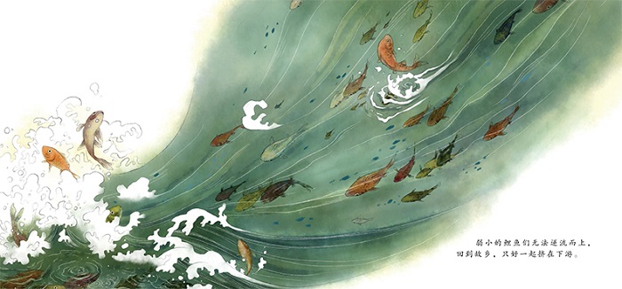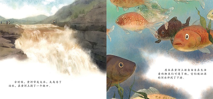 黄河里的鲤鱼们因为黄河的缺口只能生活在下游,十分不满。天帝说只要能越过黄河缺口的鲤鱼就能化身为龙,鲤鱼们都跃跃欲试,但又觉得缺口太高,望而却步。一只大红鲤鱼毫无畏惧,一鼓作气,纵身一跃,飞跃了龙门,变成了龙。