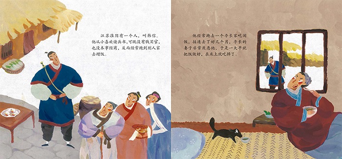 韩信很小的时候就失去了父母,主要靠钓鱼换钱维持生活,经常受一位靠漂洗丝棉老妇人的 施舍,屡屡遭到周围人的歧视和冷遇。一次,一群恶少当众羞辱韩信。有一个屠夫对韩信说:你虽然长得又高又大,喜欢带刀配剑,其实你胆子小得很。有本事的话,你敢用你的配剑来刺我吗?如果不敢,就从我的裤裆下钻过去。韩信自知形只影单,硬拼肯定吃亏。于是,当着许多围观人的面,从那个屠夫的裤裆下钻了过去。