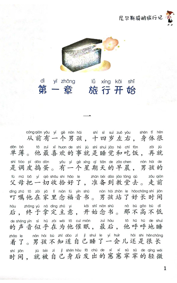 《尼尔斯骑鹅旅行记》是瑞典优秀女作家拉格洛芙于1906年发表的一部著名的儿童小说,是世界第一部也是唯一一部获得诺贝尔文学奖的童话作品。 小说讲述一个不爱学习、喜欢恶作剧的顽皮男孩尼尔斯因捉弄了精灵而被精灵用魔法变成了一个拇指大的小人儿,他骑着大白鹅跟着一群大雁作长途旅行,经历了种种艰辛,最终回到家恢复原貌,变成了一个好孩子。