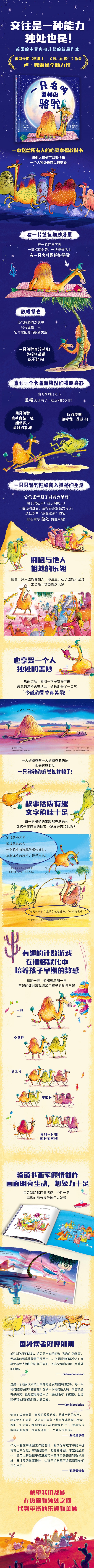 1.英国绘本界冉冉升起的新星——卢·弗雷泽联合资深插画家莎拉·沃伯顿打造的一本充满惊喜与哲思的绘本。 2.让孩子在骆驼道格的故事中,学会拥抱与他人相处的乐趣,也学会享受独处时光的美妙,拓宽自我世界。 3.文字押韵又富有节奏感,对故事的起承转合和儿童阅读心理把握得炉火纯青,每一只骆驼的出现,既活泼有趣又富有悬念。 4.画风色彩亮丽且富有想象力,每只骆驼们都活灵活现,各具特色,有非常多的小细节等待孩子们去发现。 5.国外读者好评如潮,国内资深阅读推广人邹蓓蓓老师倾情推荐。