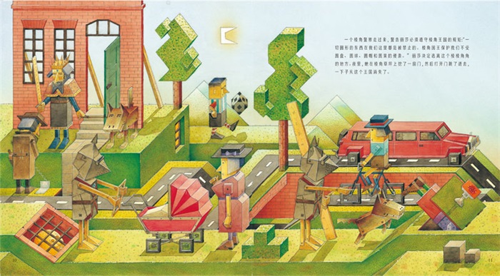本书讲述了可爱的小女孩丽莎在睡梦中来到了不同的王国。梦里的每个王国都非常奇特:“圆球王国”“棱角王国”“颠倒王国”……这些王国都奇特但偏见,可爱的小丽莎在梦中经历了一场不可思议的旅行。最终,她逃离了这些偏见王国,在充满包容的羽绒王国中结束了梦中的旅行。该书在天马行空的想象力和活泼幽默的文字之余,更蕴藏着关于颜色、图形、方位等的认知,是一本兼具趣味性、文学性、功能性的绘本。