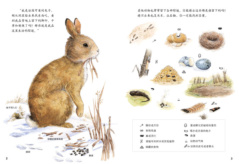 不管是草原荒漠,还是高山海洋,甚至是村庄与城市,都有动物生存的痕迹。瞧,那雪地上的小脚印从地洞伸向远方,不正是告诉我们这是兔子留下的吗?春天小溪里的黑色卵群,不正是青蛙妈妈存在的证据吗?还有树叶背面的虫卵、森林地上的坚果壳……本书中展示了80多种动物留下的蛛丝马迹,包括动物们的行踪线索、生活习性、身体特征等内容。带着对动物世界的好奇心,一起来探索其中的奥秘吧!