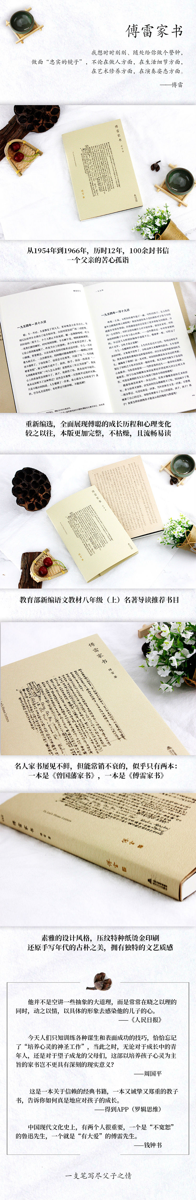 《傅雷家书》是傅雷写给孩子傅聪的书信摘编,时间跨度为1954年到1966年,话题没有局限于生活琐事,还涉及到艺术与人生的诸多方面,饱含着为人父母的情感与责任,充满了对子女炽烈而深沉的爱与期望。