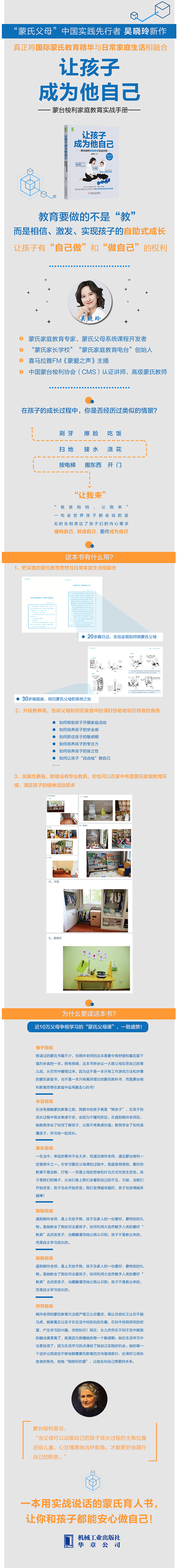 蒙氏教育在诞生百年后,得到了国际幼儿教育界的普遍推崇和认同,但出于种种原因,我们中的大部分人并未接触过真正的蒙氏家庭教育。 ●20多篇日记,生动呈现如何做蒙氏父母 ●30多幅插画,明白蒙氏父母的高明之处 ●100多个案例,了解蒙氏父母的日常状态 ●蒙氏父母如何帮助孩子开展家庭活动 ●蒙氏父母如何培养孩子的安全感 ●蒙氏父母如何抓住孩子的敏感期 ●蒙氏父母如何培养孩子的专注力 ●蒙氏父母如何培养孩子的独立性
