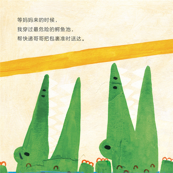 放学了,妈妈还没有来接小象,哎呀,要等好久,该怎样度过这段等妈妈的时光呢?小象充分发挥自己的想象力,他想象自己很勇敢,独自走过危险的鳄鱼池,帮忙送快递;他想象自己很勤劳,帮杂货店把鸡蛋送给鸡蛋糕叔叔;他想象自己玩游戏,和猫咪比赛爬树抓鱼;他想象自己去探险,在一个无人的小岛住了8个礼拜……终于,妈妈来了,小象欣喜若狂,可以回家啦!