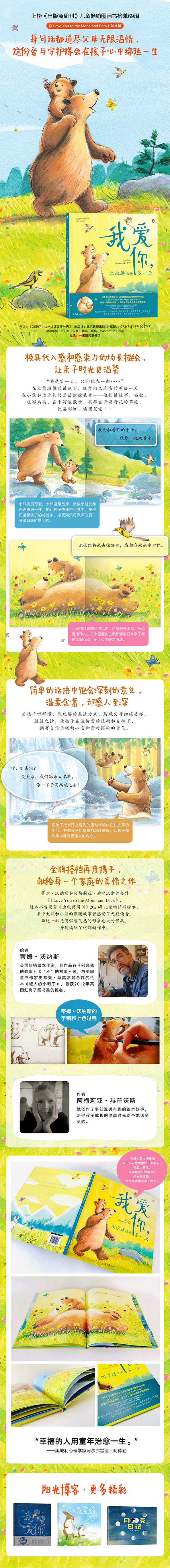 《我爱你,比永远还要多一天》是一本表达父母对孩子无私而坚定的爱的亲子绘本。本书用诗意而质朴的语言,充满童真和想象力的画面,描画了大熊和小熊如何度过想象中的一天,能够让孩子快速带入到小熊的身份中,感受到父母深深的爱,获得满满的安全感,并懂得亲情的可贵,同时在这份爱的鼓励和支持下,拥有面对困难的勇气。