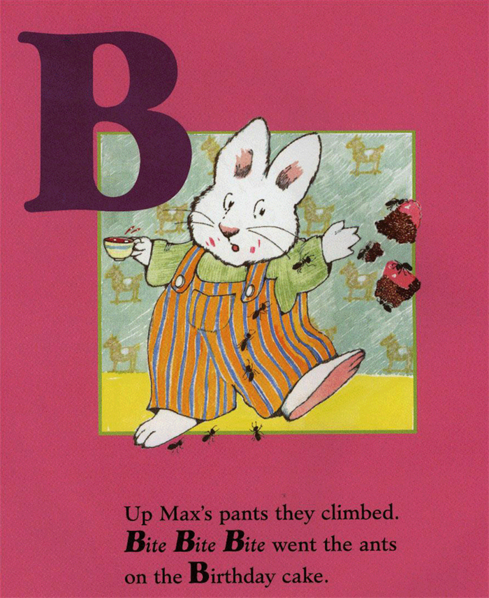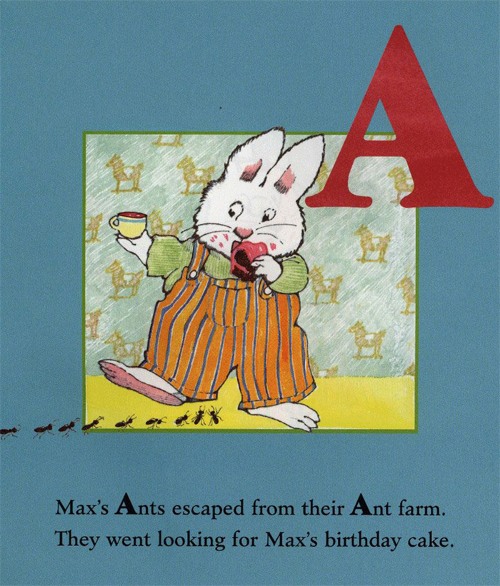 Learn the alphabet Max and Ruby style! EverybodyÂ’s favorite bunnies, Max and Ruby, are back, starring in their very own ABC concept book. MaxÂ’s ants have escaped from their farm, and now theyÂ’re searching for food. The ants start with MaxÂ’s sandwich, and soon theyÂ’re everywhere! Fortunately, Ruby comes to the rescue. MaxÂ’s ABC teaches the alphabet by featuring a differen...