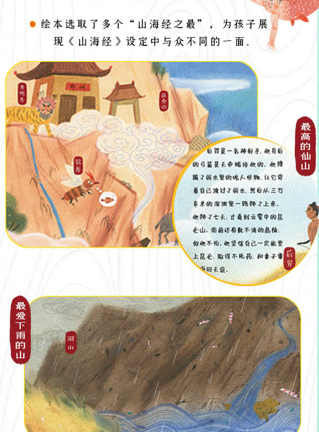 ★推荐2.选篇经典、绘图严谨。本书从《山海经》多个山脉中精选出32个大幅场景,这些场景既能体现《山海经》的精华,又适合孩子的阅读习惯,多个场景之间还有互动,能够引起孩子的阅读兴趣。书中的怪兽形象都是在经典绘图的基础上细化创新,不仅让孩子看得清楚开心,而且有深厚的文化支撑,不会误导孩子。