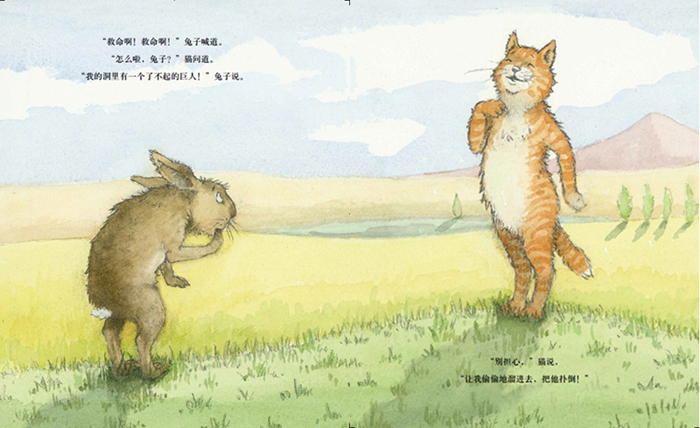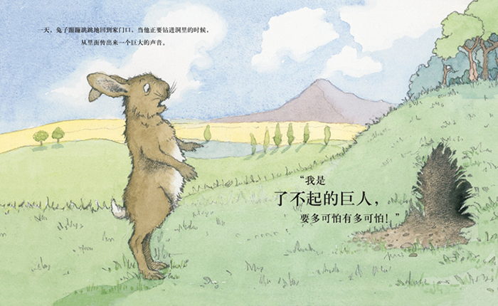 该书的内容取材于传统民间故事:有一天,一只兔子发现有个自称“了不起的巨人”的怪物霸占了它的家,兔子吓坏了,于是它向猫发出求救,没想到猫也被那个神秘而巨大的声音吓跑了,随后来帮忙的熊和大象也都如此。这个怪物到底是谁?孩子们会被这个幽默机智而又悬念迭生的故事深深吸引,想要不断地读下去,直到揭开谜底,而最终的结果又是如此出人意外。