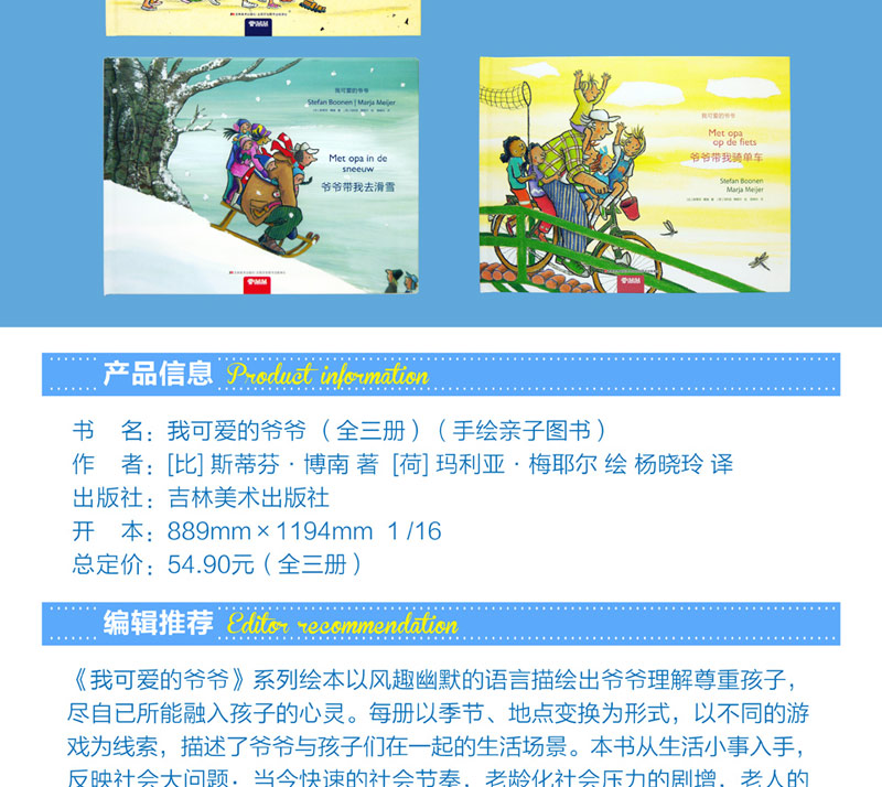 《我可爱的爷爷》套装绘画精美,语言轻松简练,合理引导小朋友的艺术观感,画中从每个细节勾画出一位年迈又可爱的爷爷:他快乐地与孙子孙女玩耍,快乐的身影遍布雪地、郊外和海滩。本书的社会意义即孩子需要成人的陪伴,成人也需要孩子的陪伴,沟通应无限。