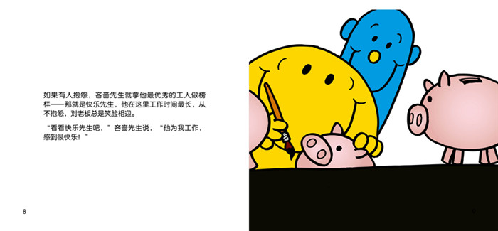 讲述了吝啬先生非常小气,他开了一个工厂,一年只休息一天,几乎不给工人发工资。圣诞前夜,阳光小姐邀请他们去吃午饭,但是他们拒绝了。那天晚上,吝啬先生做了一个梦,梦到了好奇先生、智慧小姐和霸道小姐,他们都非常不快乐。吝啬先生起床后就冲进了商店买礼物。通过有趣的故事教会小朋友们要懂得分享,不能自私冷漠。