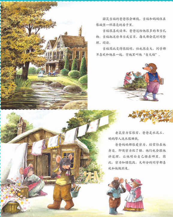鼹鼠吉福的爸爸很会赚钱,吉福和妈妈住在像城堡一样漂亮的房子里。 吉福很喜欢读书,爸爸送给他很多的书当礼物。吉福把这些书当成宝贝,每天都会花时间整理、阅读。 吉福因此变得很聪明、很自大,同学都不喜欢和他在一起,背地里叫他“自大福”。 老鼠密力家很穷,爸爸是水泥工,妈妈帮人洗衣服赚钱。 老鼠爸爸妈妈都爱密力,经常陪在他身边。即使犯了错,他们也会跟他讲道理,让他明白自己错在哪里。因此,密力知错能改,大部分的同学都喜欢和他做朋友。 密力也很喜欢读书,可是,因为家里穷,没办法买书,他只好到图书馆去借书来看。