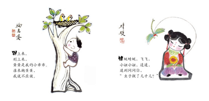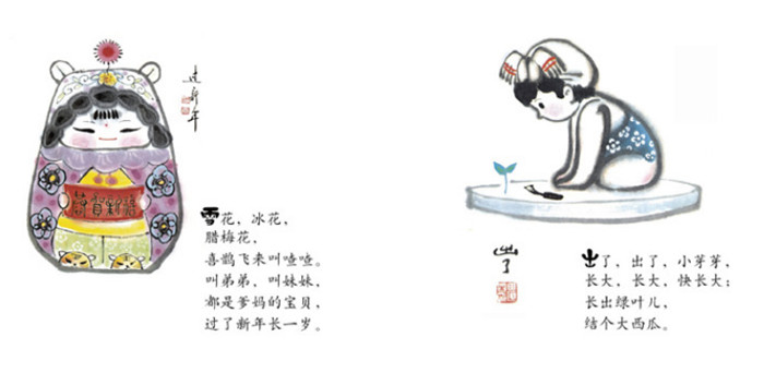 这是一本儿童插图短诗集。全书由24幅儿童画和为之写作的小诗构成,比如《出了》这一页,画了一个蹲坐在地上,专心致志地看着一棵小芽的孩子,旁边配着小诗:“出了,出了,小芽芽,长大,长大,快长大;长出绿叶儿,结个大西瓜。”小诗节奏轻快,口语化的文字朗朗上口,让孩子很容易记住。写的画的又是孩子身边的事情,让孩子倍感熟悉。因为作者和绘者都是老一辈的中国艺术家,这本小书里使用了大量地道中国味的元素,如荷花、葫芦、兔子灯、大刀、琵琶、荷花鱼缸。此外,书里很多的小孩形象还脱胎自了惠山泥人大阿福,十分惹人疼爱,充满了民间艺术美感。