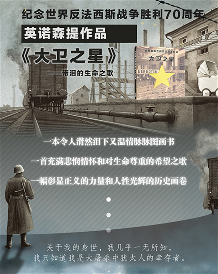 《大卫之星》是当代著名的图画书作家英诺森提代表作之一。这本书是继《铁丝网上的小花》后,英诺森提又一部以绘本的形式表现二战题材的作品,英诺森提以超写实的绘画技巧,深沉的色调,细致而深刻地描写了犹太人二次世界大战在纳粹的残酷统治下的悲惨遭遇。画家把那个时代令人压抑窒息的氛围用灰暗的色调展现地淋漓尽致。英诺森提把他悲悯的情怀和对生命的尊重融入到画作里,让读者在阅读故事的同时得到强烈的艺术震撼。