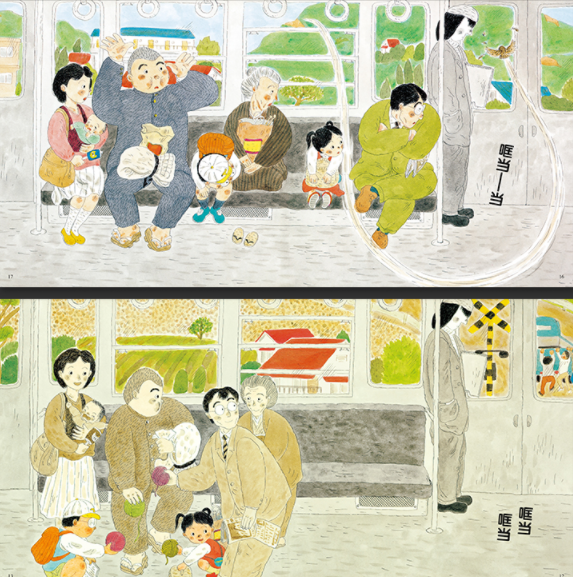 荣获第12回日本绘本赏作品——《哐当哐当哐当》:在公车上,窗外是明媚多彩的风景,可车厢内的乘客却都是灰色的,大家面无表情,没有任何对话,只有列车驶过铁轨的声音“哐当哐当哐当”。这时,公车里一个小女孩怀里的小猫咪跳了出来,打破了公车里的安静。首先是一个小男孩,帮小女孩抓住了小猫咪,他们两身上有了颜色。接着,小男孩身边的一个大哥哥分享了一本漫画,那位哥哥也跟着有了颜色。接下来,车上还发生了什么呢?人与人心间的冰一点点融化,呼唤从自己的世界走出来,学会发现周围的人和事物。画面由静转动,由黑白转向明亮的彩色,让孩子体验走出自己的世界,融入这个多彩的世界带来的快乐。
