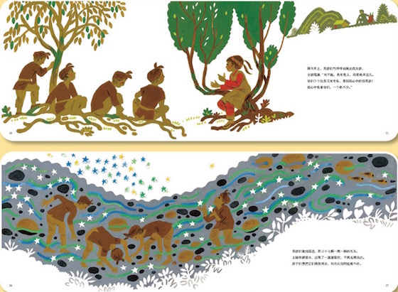 在捡石头的画面里,男孩们在水中小心翼翼地捡拾石头;天空上,画家别具匠心地用平行并连接着的叶子形状画出太阳、星星来表现“三天三夜”,整幅画面将不同的时间、空间并列在一起,带来一种时空交错之感。夕阳西下,妈妈走出屋子。画家把人物用橙色描边,象征着一家五口的亲密快乐。而十年后的争吵中,当孩子们脱口而出“你算什么?溪边的白石头”时,月光下的妈妈和孩子们,罩上了一层绿色。这种细节处的光影变化,在视觉上产生了强烈的对比。