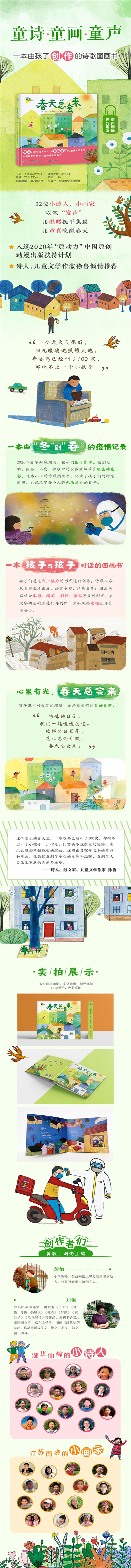 一本由湖北小朋友亲历“发声”的诗歌图画书。32位小朋友线上接力,以童诗童画汇聚春天的希望。 《春天总会来》收录了孩子们在2020年春节封城期间创作的19首诗歌和18幅图画,诗歌内容从真实生活出发,语言童稚,情感真挚,题材丰富,记录了他们在疫情期间的生活点滴和所思所想,有等待父母回来的焦灼和想念,对一线抗疫人员的尊敬和赞美,对社会新闻的所思所想,以及想要拥抱春天的迫不及待和赤诚渴望……这是一份供全社会重新审视疫情、记录疫情的历史见证,也为全球仍未结束的抗疫斗争带来温暖和希望。