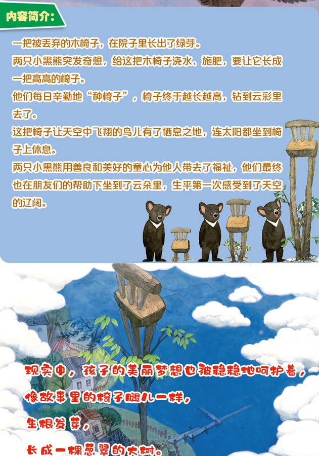 怀着美妙的梦想,两只小黑熊每日辛勤地“种椅子”,椅子终于越长越高,钻到云彩里去了。这把椅子让天空中飞翔的鸟儿有了栖息之地,连太阳都坐到椅子上休息。故事里的两只小黑熊用善良和美好的童心为他人带去了福祉,他们*终也在朋友们的帮助下坐到了云朵里,生平*次感受到了天空的辽阔。现实中,孩子们心中的美丽梦想也被稳稳地呵护着,像故事里的椅子腿儿一样,生根发芽,长成一棵葱翠的大树。