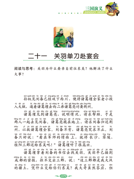 《三国演义》描写的是从东汉灵帝建宁二年(公元169年)开始,到晋武帝太康元年(公元280年)为止的一百多年间发生的事件,重点描写了魏、蜀、吴三个国家间的兴衰故事。本书收录、改编了其中四十多个相互关联、经典的故事。其中,《官渡之战》《火烧新野》《草船借箭》《赤壁之战》《水淹七军》等故事,有惊心动魄的战争场面;《桃园三结义》《三顾茅庐》《千里走单骑》《华容道放曹操》《刮骨疗毒》等故事,成功了刻画了英雄好汉;《曹操献刀》《舌战群儒》《蒋干盗书》《单刀赴会》《七擒七纵》等故事,写出了人物之间斗智斗勇的情形。