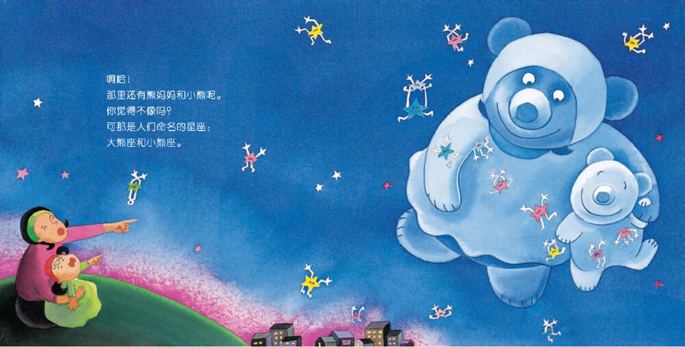 宝宝,你看到在漆黑的夜空中,闪闪发光的星星了吗?宝宝!看到那里的七颗星星了吗?如果把它们用线连起来,就会呈现出勺子的形状。它们就是北斗七星。啊哈!那里还有熊妈妈和小熊呢。你觉得不像吗?可那是人们命名的星座:大熊座、小熊座。“月亮、星星,你们好!”宝宝在向它们打招呼。月亮笑了笑,星星眨了眨眼睛。……