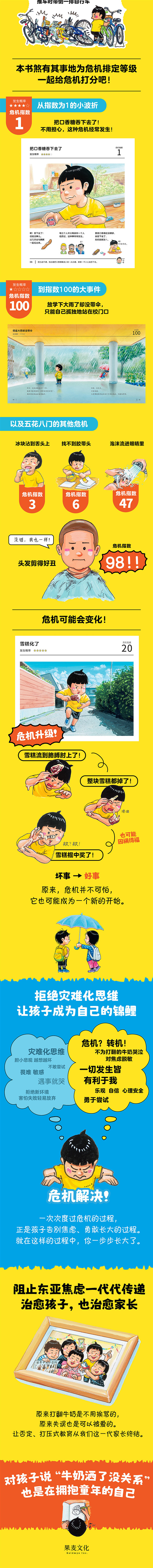 1. 国际爆红,终于引进!“绘本鬼才”铃木典丈超人气新作 系列畅销270万册、荣获13项绘本?奖。每个孩子都值得拥有的锦鲤绘本,帮孩子收获度过挫折的勇气和智慧。 2. 超有趣的高频“危机”日常,精准戳中童年小心思 牛奶洒了?作业本湿了?下雨没带伞?!小时候,谁没有因为一件小事,觉得天都要塌了? 小时候的许多小事,都是天大的事——这本书精准捕捉了孩子的普遍烦恼,温柔安慰焦虑心情。每个翻开这本书的孩子,都能感到自己的情绪被看见、被理解。 3. 用幽默对抗焦虑,危机指数-1 -1 从指数为1的?波折,到指数100的?事件,本书煞有其事地为危机排定等级。每个问题背后,都?轻松的?吻告诉孩?——没关系!倒霉会过去,危机会变成转机。就在这样的过程中,你?步步长大了。 4. 拒绝灾难化思维,养出不怕事的淡定小孩! 不要为打翻的牛奶哭泣,从胆小悲观、越想越坏的灾难化思维,转变为乐观自信、勇于尝试的正面思维,让孩子成为自己的锦鲤。 5. 阻止东亚焦虑一代代传递,治愈孩子,也治愈家长 原来打翻牛奶是不用挨骂的,原来失误也是可以被爱的……让否定、打压式教育从我们这一代家长终结吧,对孩子说“牛奶洒了没关系”,也是在拥抱童年的自己。