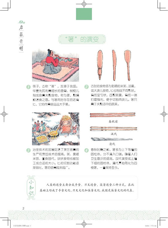 “中华传统文化传承系列· 小学生食育”是一套为小学生编写的,以传承中华传统饮食文化、科学饮食教育为主要内容的系列丛书。丛书精选生动有趣的饮食文化故事,在轻松的阅读中,让同学们了解中国优秀传统文化,习得传统礼仪;丛书设计烹饪活动和实验操作活动,在动手实践中,让同学们认识食物、食材,了解营养健康知识,养成科学的饮食习惯。丛书关注文化传承,关心儿童健康,为儿童留存中国味道和中国记忆。 丛书共四卷,按一年春夏秋冬四个季节的顺序来编写。每一卷8课,一共32个主题,包括食材与食物主题、营养主题、饮食文化主题等。每一个主题都包含了六个栏目: “启蔽开明”通过故事和操作活动讲述我国传统的食材、食具、食物的由来; “食经窥要”主要介绍食物中的营养素,以及饮食文化的源起; “怀古鉴今”通过传统饮食故事,让同学们了解中国传统饮食文化; “古礼撷萃”让同学们在探讨古礼的过程中,形成对传统礼仪的认识; “助学小行”让家长和孩子们一起动手,共同成长;