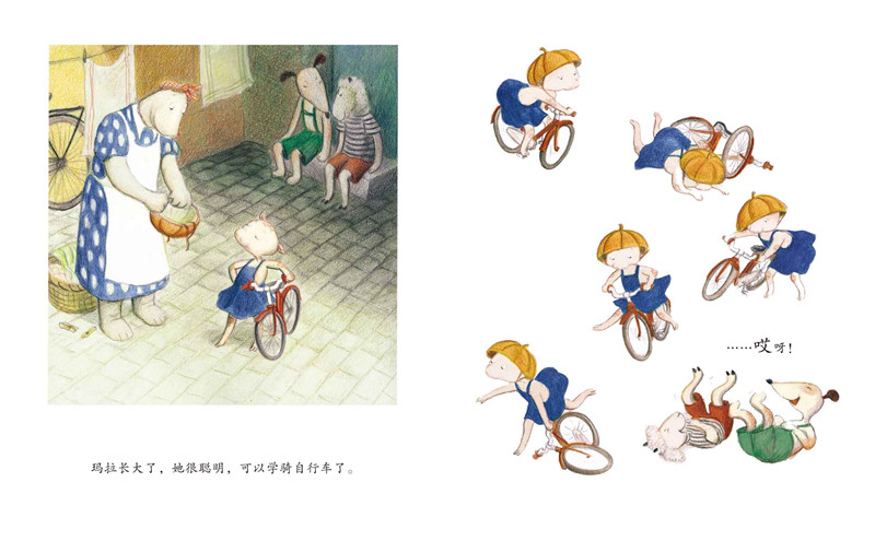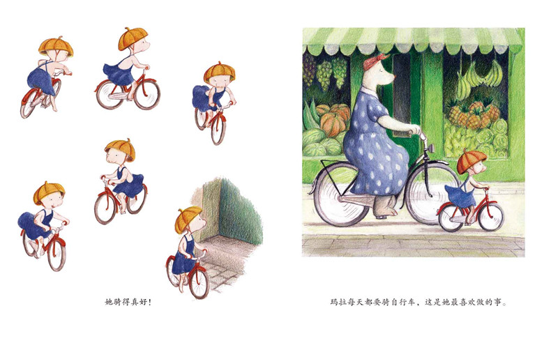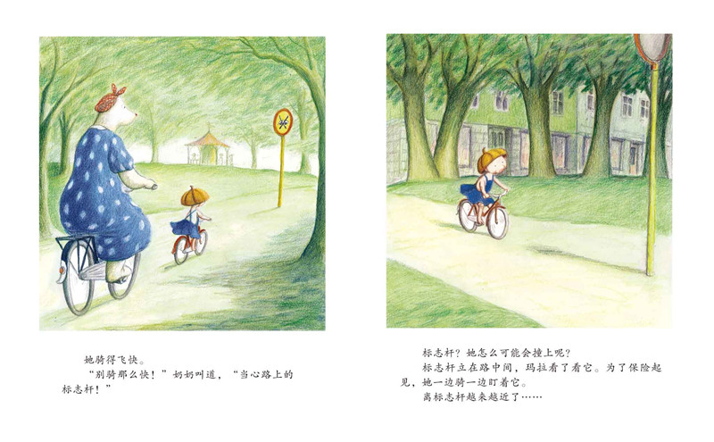 第二本,描述了小玛拉第一次练习骑自行车的经历。玛拉觉得自己长大了,她在奶奶的帮助下开始练习骑自行车。奶奶提醒她路上有个交通标志杆,千万不要撞到了,玛拉小心翼翼地盯着那根杆,还是撞上摔了一脚;前面走着一位叔叔,玛拉一直紧张地盯着他,结果还是撞上了……在那位叔叔的帮助下,玛拉掌握了一个诀窍,终于学会骑自行车,再也不会撞到人了!