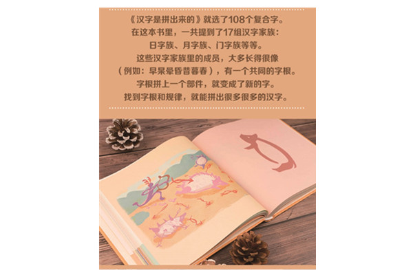 《汉字是拼出来的》就选了108个复合字。在这本书里,一共提到了17组汉字家族:日字族、月字族、犬字族等等。这些汉字家族里的成员,大多长得很像(例如:早杲晕昏昔暮春),有一个共同的字根。字根拼上一个部件,就变成了新的字。找到字根和规律,就能拼出很多很多的汉字。