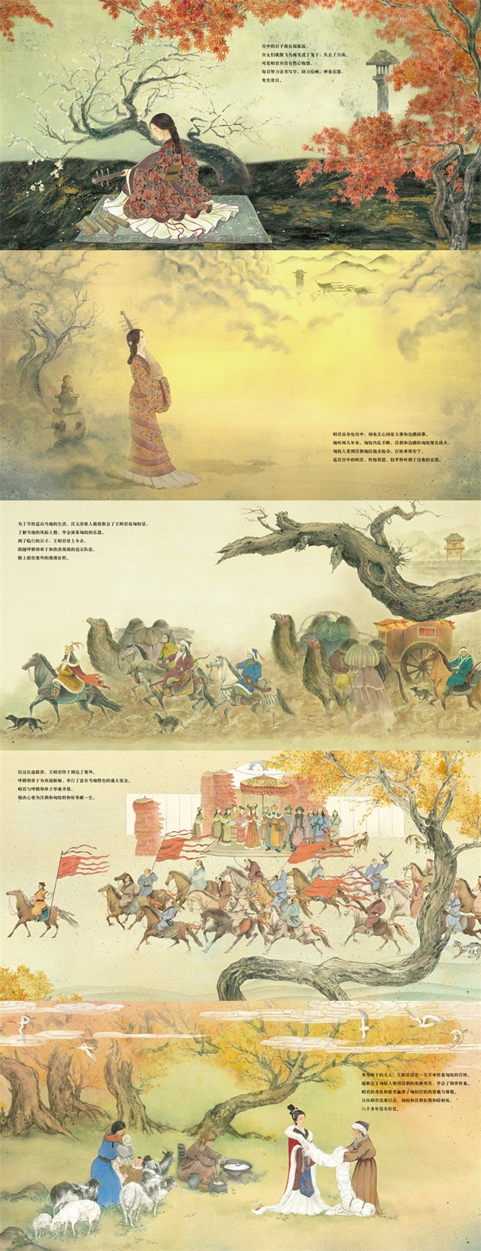 绘本《昭君出塞》从汉时与匈奴在边塞累有战事开讲,讲述昭君“请缨赴塞上”,终老塞上,完成和亲宁边使命、促成民族和睦的一段佳话。绘本故事不仅展现了王昭君“落雁”的美貌,更刻画了王昭君出塞的心路历程,表现了其在汉匈关系中的重要地位及深远的影响,塑造了更加丰满的人物形象,弘扬了王昭君身上的民族大义与勇气,从而表现出华夏民族的大爱情怀和家国情结。