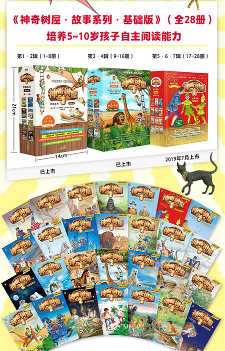 “神奇树屋·故事系列基础版”全套28本,第1·2辑一共包括8本:《勇闯恐龙谷》《古堡惊魂夜》《木乃伊之谜》《寻宝加勒比》《忍者的秘密》《亚马孙探险》《勇斗剑齿虎》《月球漫游记》