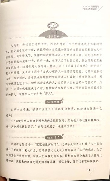 本书主要是一些议论性质的短文,主要讲述培根从不同的角度看待事物的态度和想法,涉及政治、经济、宗教、爱情、婚姻、友谊、艺术、教育、伦理等许多方面,其中有《论读书》《论真理》《论嫉妒》《论死亡》《论美》等著名篇章,是培根文学方面的代表作。本书语言简洁,文笔优美,说理透彻,警句迭出,蕴含着培根的思想精华。